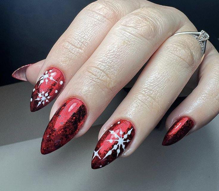 Deep red chrome nails paired with subtle black undertones and white snowflakes create a dramatic winter aesthetic. The sharp, glossy finish gives the set a bold, icy edge.