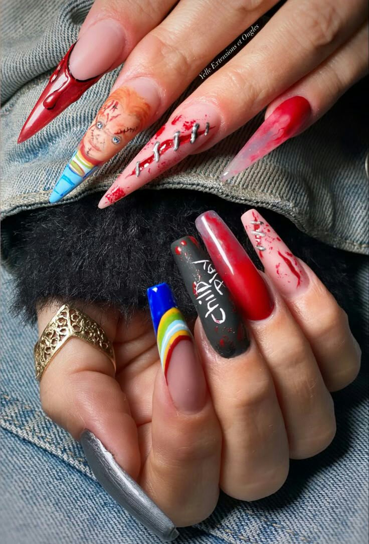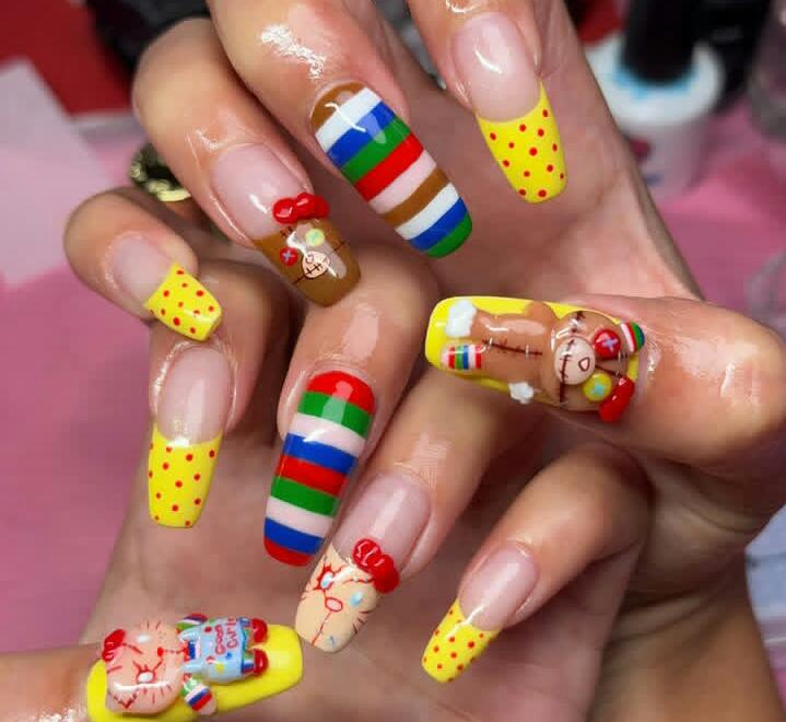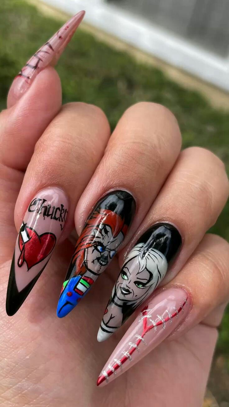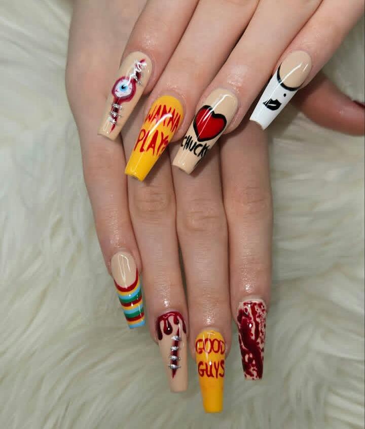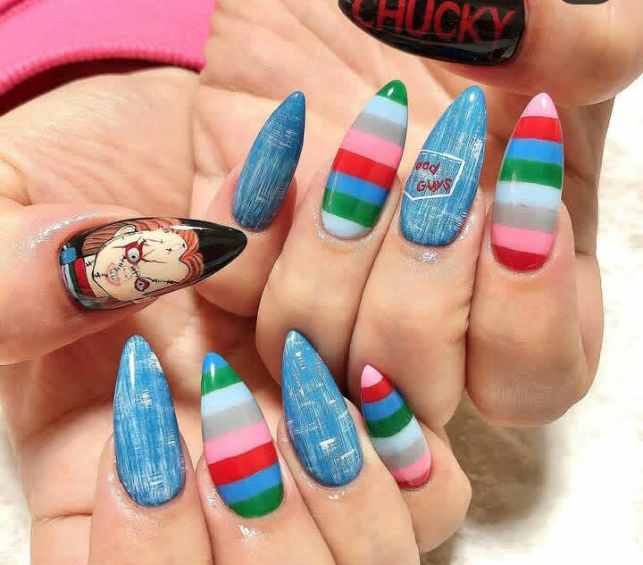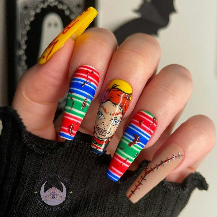 Bright and graphic, these nails showcase Chucky’s outfit, stitched patterns, and bold lettering for a playful but creepy effect.