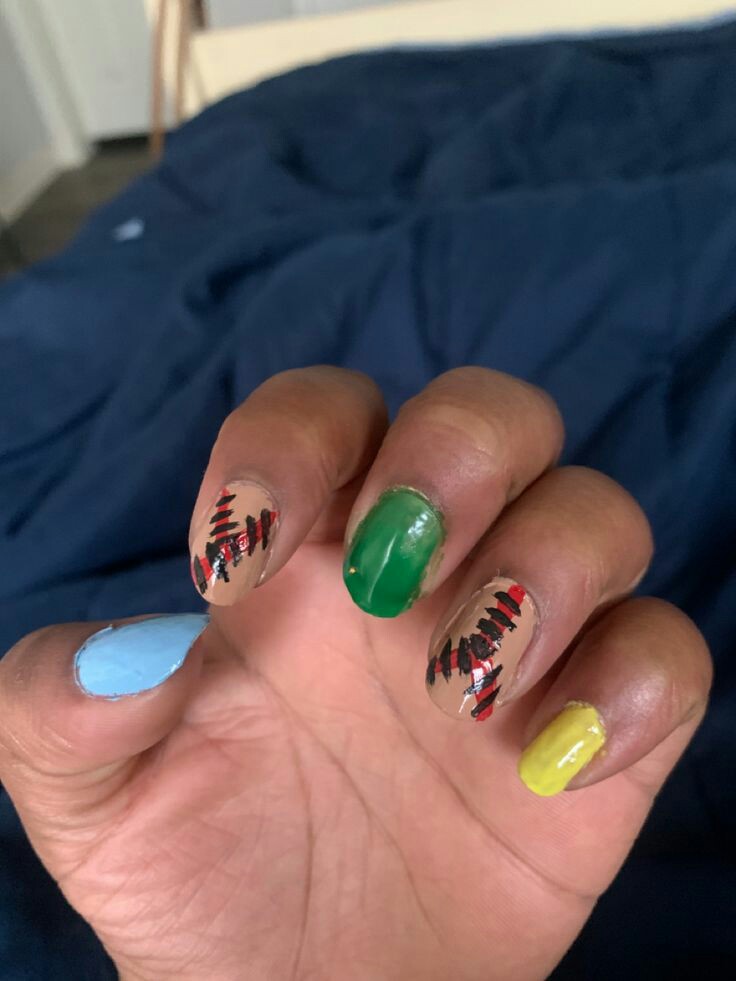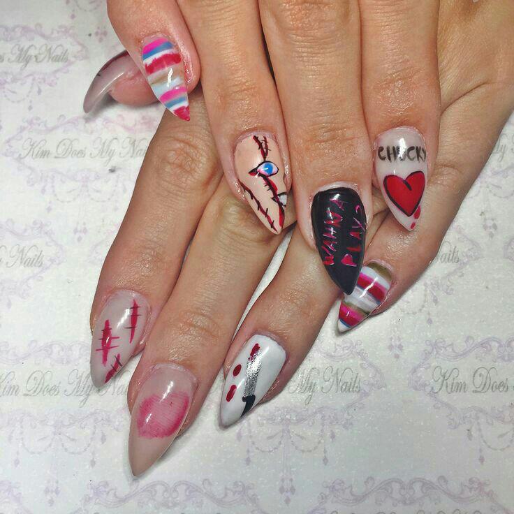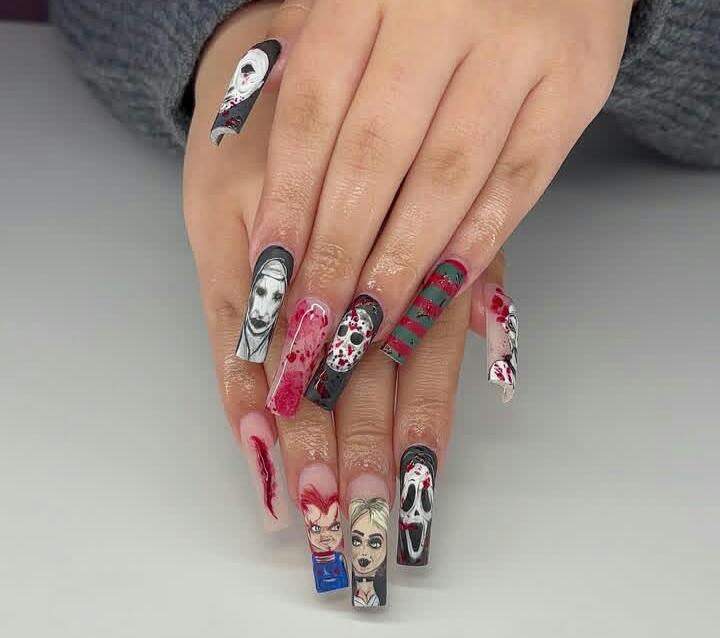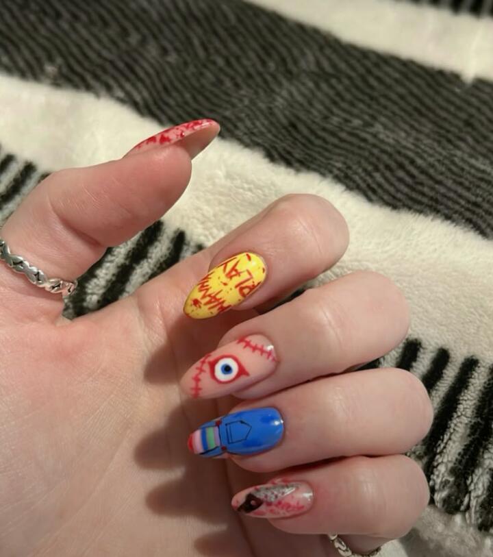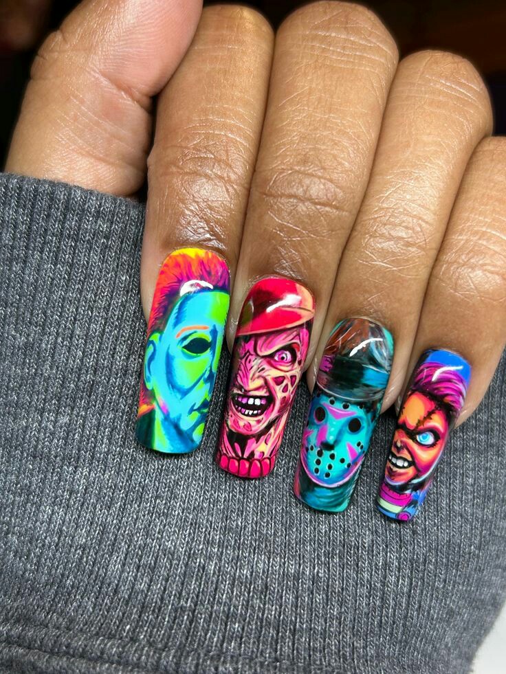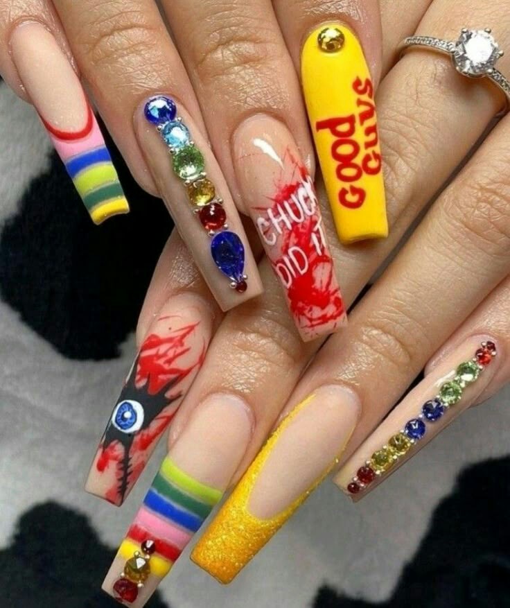 Bright and graphic, these nails showcase Chucky’s outfit, stitched patterns, and bold lettering for a playful but creepy effect.