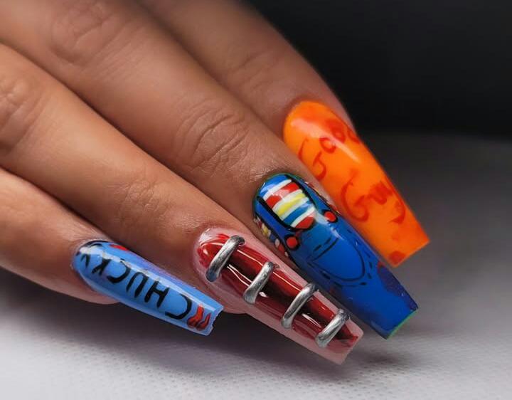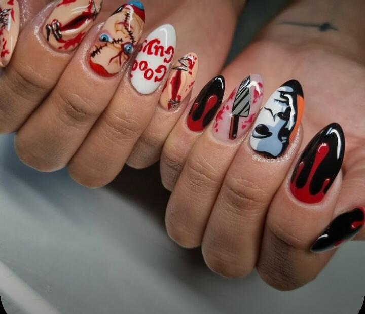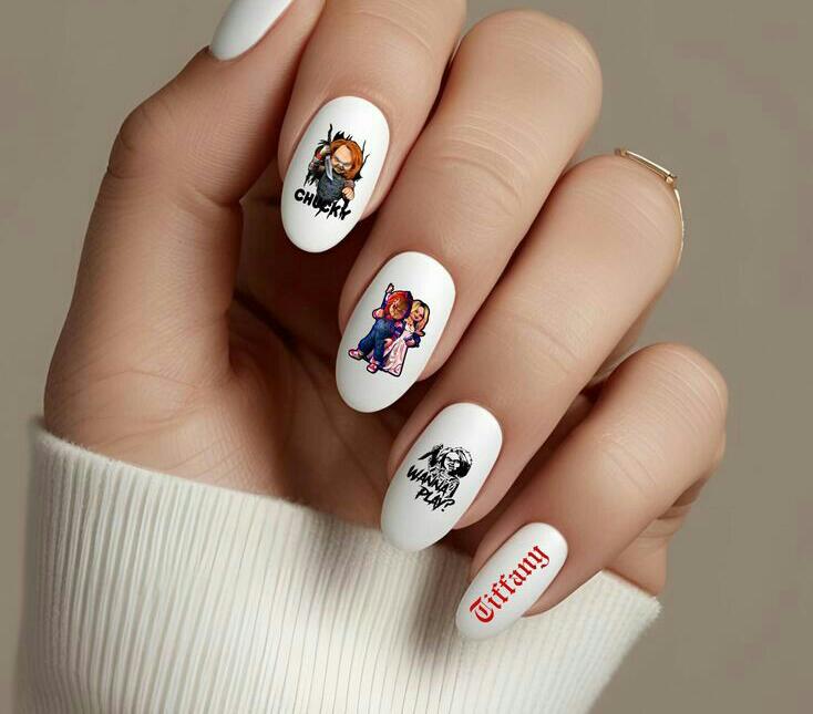 Chucky-inspired nails are the perfect mix of creepy and playful, bringing tiny horror movie chaos to your fingertips.