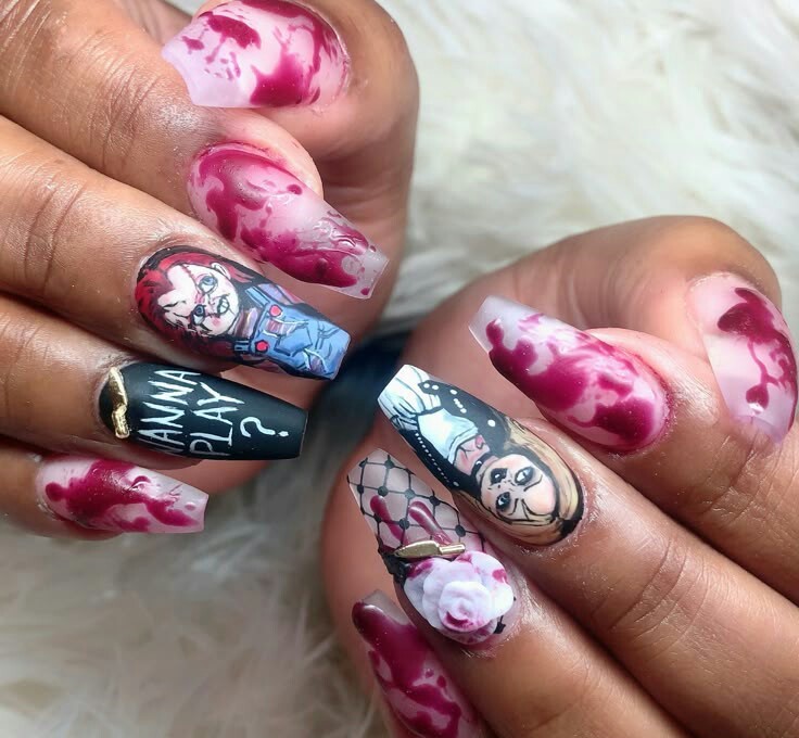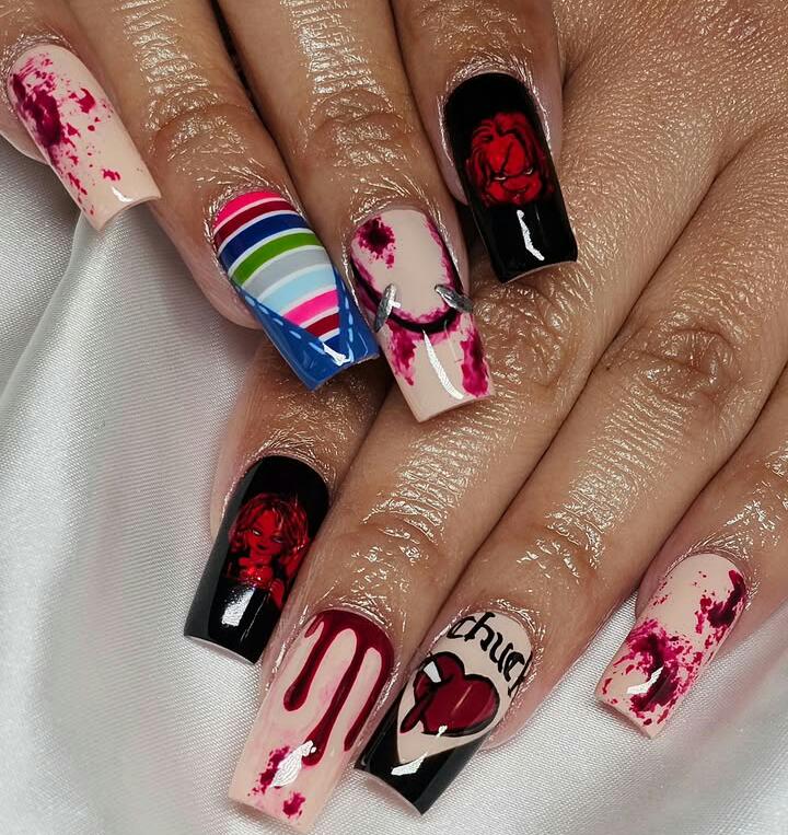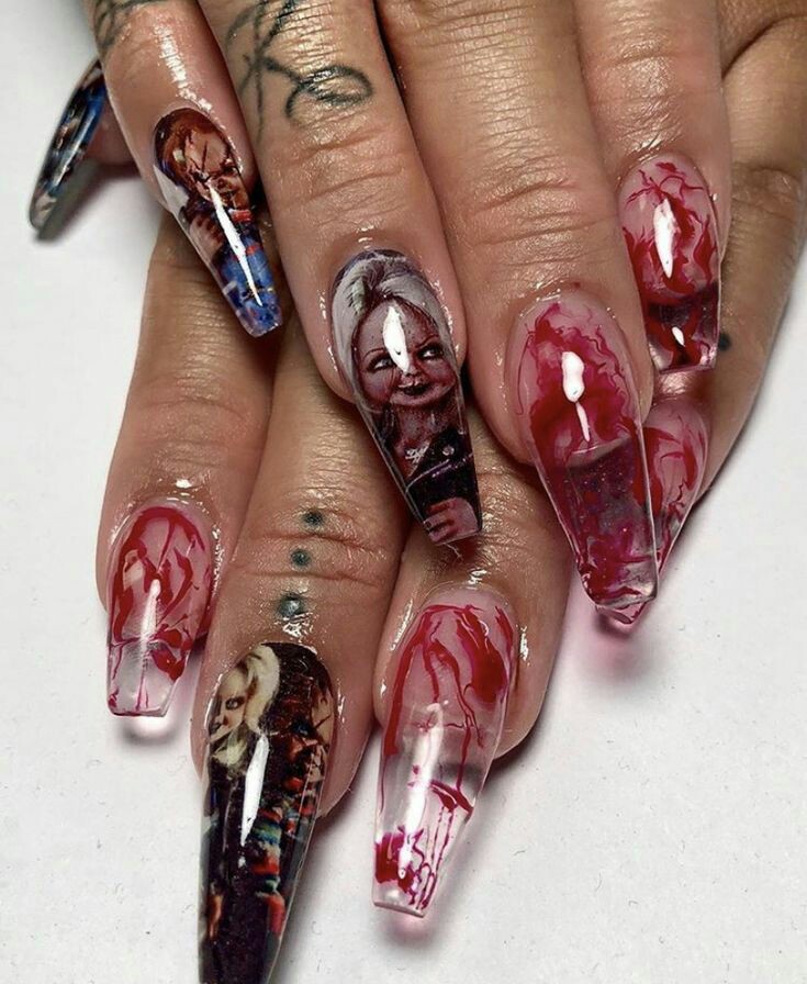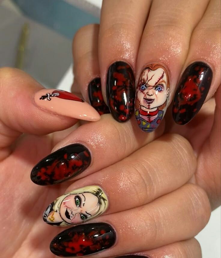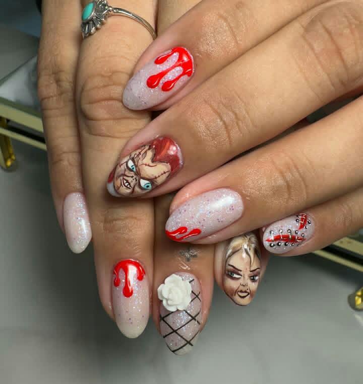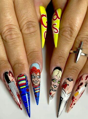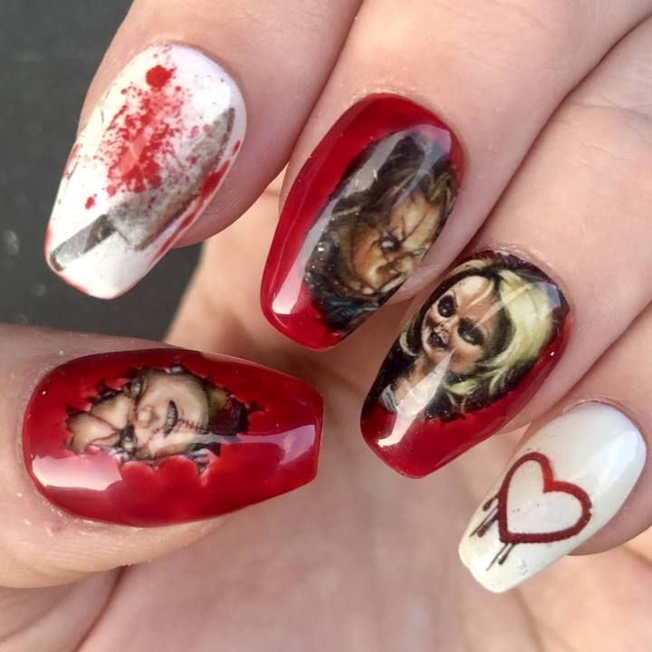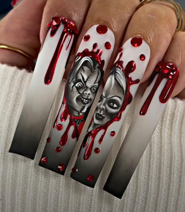 Black-and-white ombré nails dripping with red “blood” and detailed Chucky and Tiffany portraits.