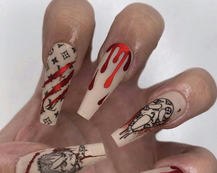 A nude base with bold red blood drips and scratch-like streaks, paired with edgy tattoo-style chucky art for a sinister yet stylish look.