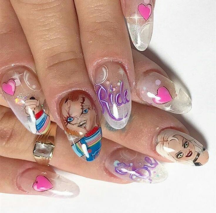 Clear glossy nails with pink hearts and portraits of Chucky and Tiffany, mixing creepy with playful romance.