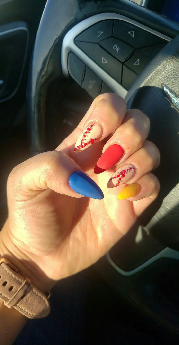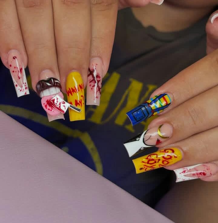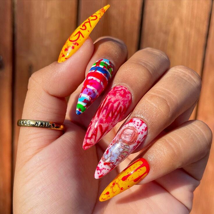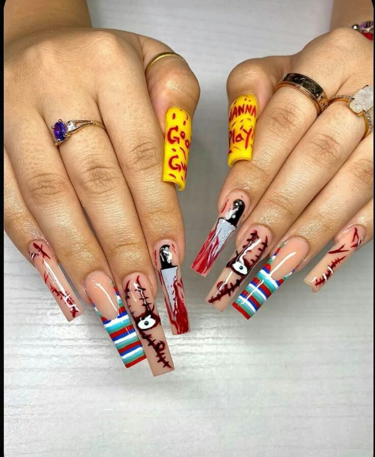 Bold red and yellow nails with splattered blood details and Chucky accents for a messy horror look.