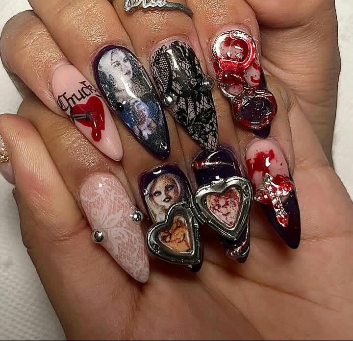 These nails mix gothic lace, bloody accents, and character portraits for a dramatic, horror-inspired vibe.