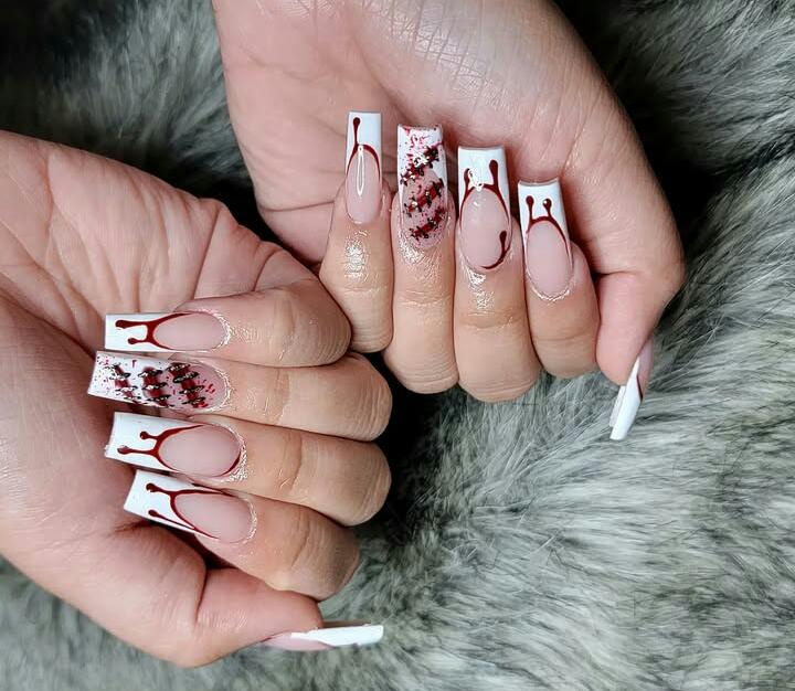 Classic French tips get a sinister twist with dripping blood details and dark glitter for a simple yet eerie style.
