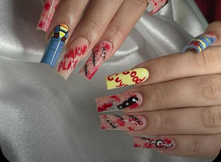 Bold coffin nails with stitched patterns, blood splatters, knives, and bright “Good Guys” details, perfectly capturing Chucky’s chilling vibe.
