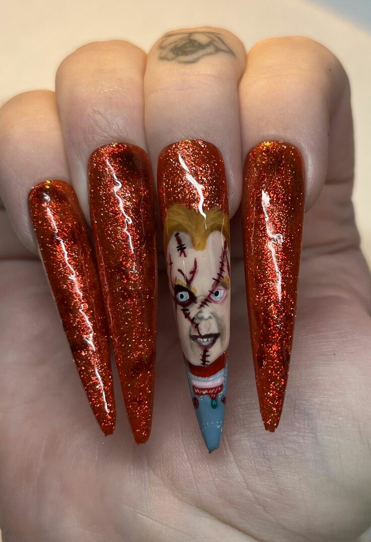 Dark and glittery red nails with a detailed, menacing Chucky portrait at the center, giving a fiery and intense effect.