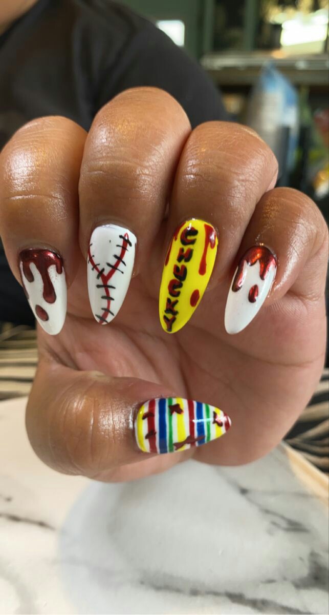 White, yellow, and striped nails with dripping blood designs and stitched details, capturing both the playful and gruesome sides of Chucky.