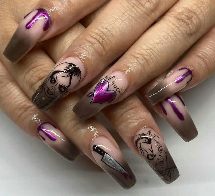 Smoky brown ombré nails with hand-drawn sketches of Chucky and Tiffany, paired with purple accents and creepy blood-drip details.