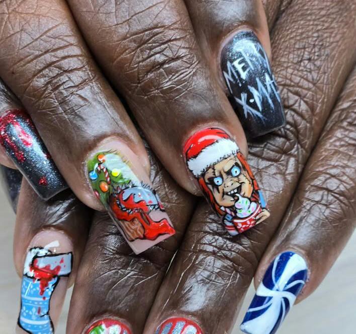 A holiday horror twist featuring Chucky in a Santa hat, bloody festive details, and candy-inspired nail art blending spooky and cheerful.