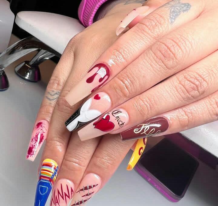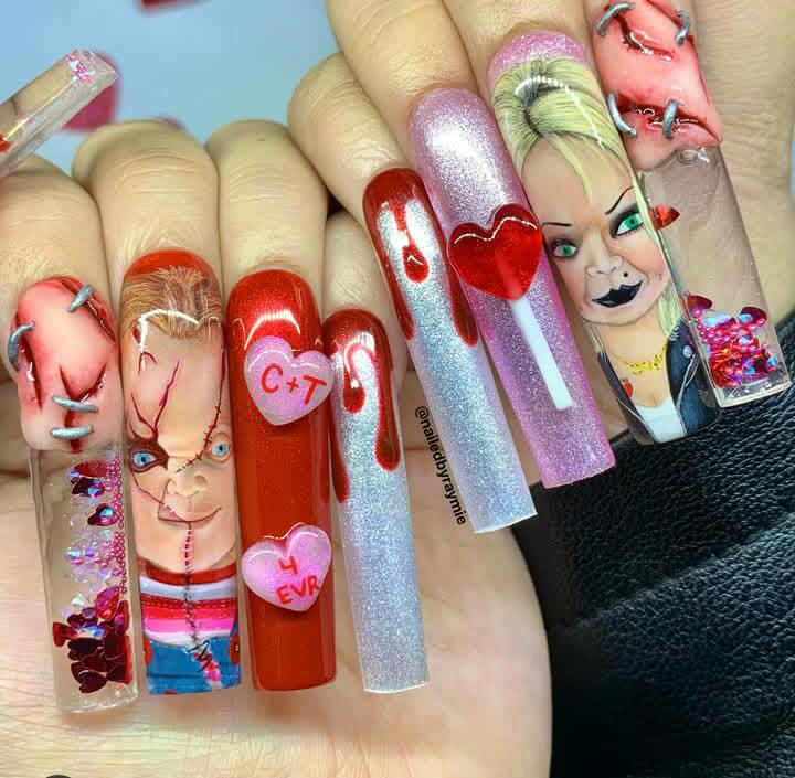 Long coffin nails with bold reds, silvers, and hearts highlight chucky’s terrifying face, blending horror with a twisted Valentine’s look.
