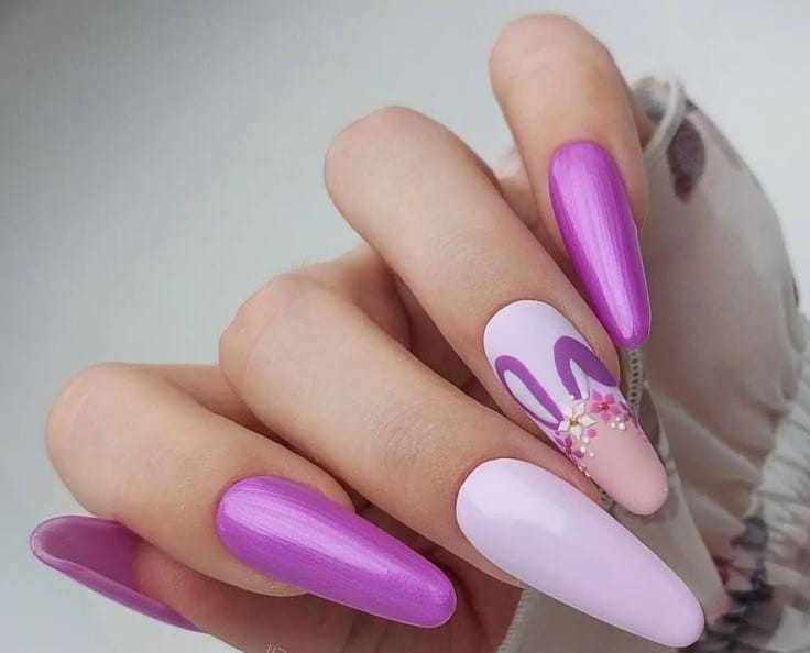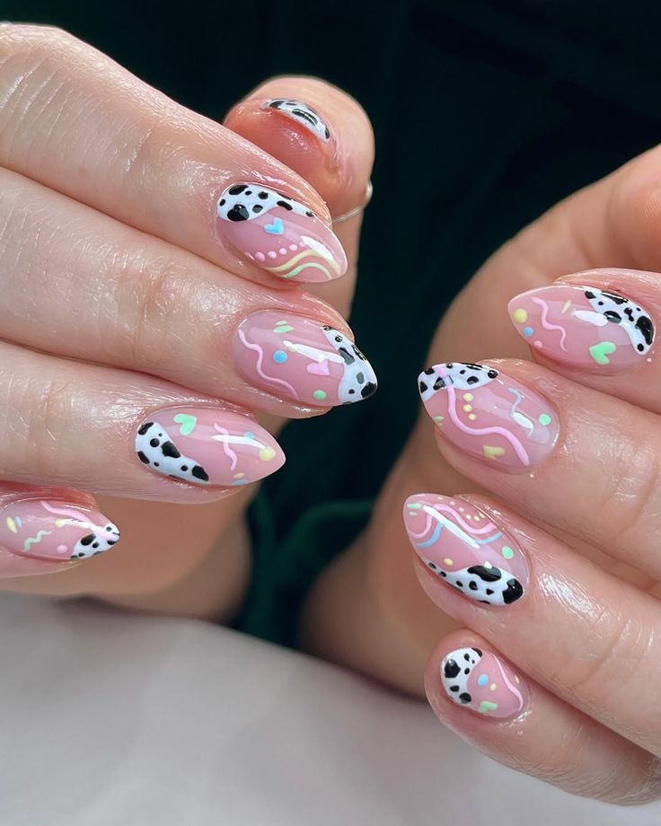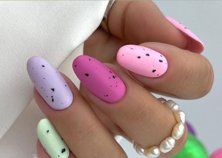 Soft pastel shades like lilac, pink, and mint are paired with a subtle black speckled effect for a playful yet polished look. The almond shape keeps it elegant while the colors give it a light, Easter-ready charm.