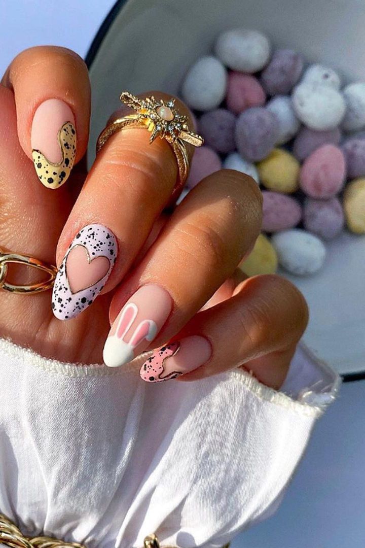 Neutral blush tones are elevated with speckled egg patterns, heart accents, and minimalist bunny art. It’s a chic and modern take on Easter nails with a playful twist.