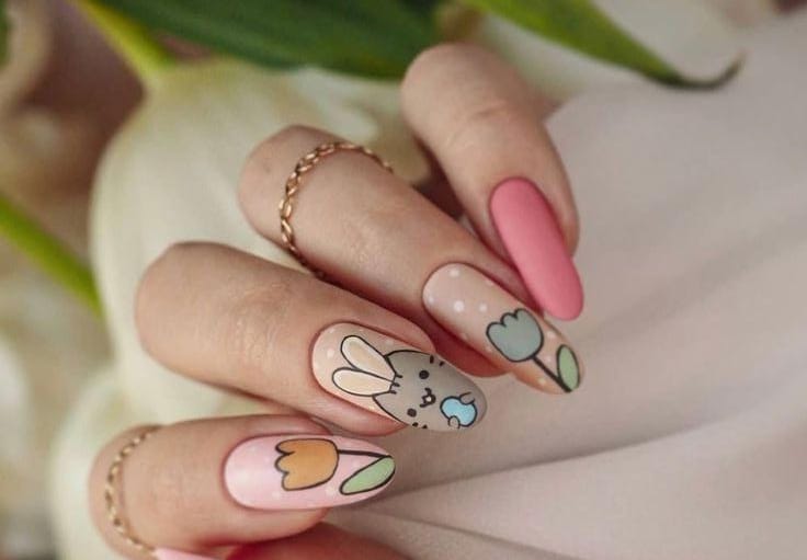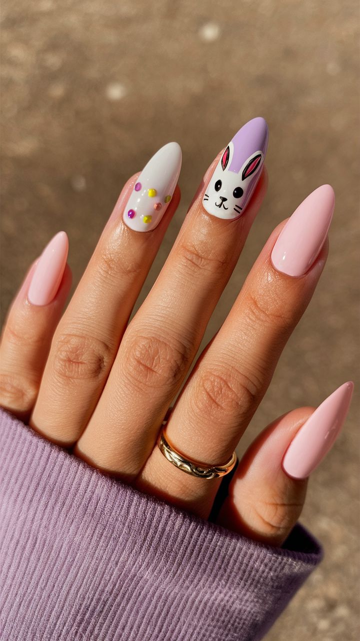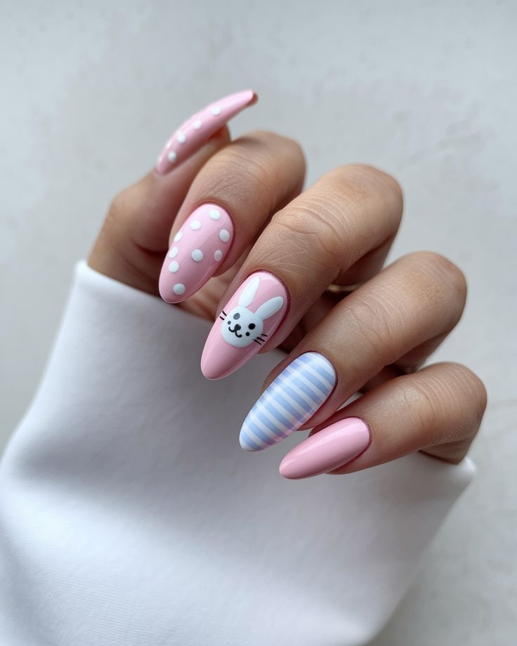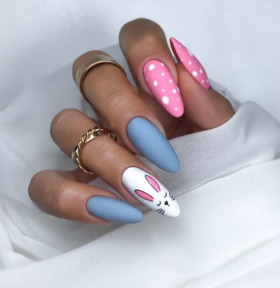A playful mix of matte blue and pink nails with white polka dots and a cute bunny accent creates a soft yet fun Easter vibe. The almond shape and pastel palette keep it classy while still feeling festive.