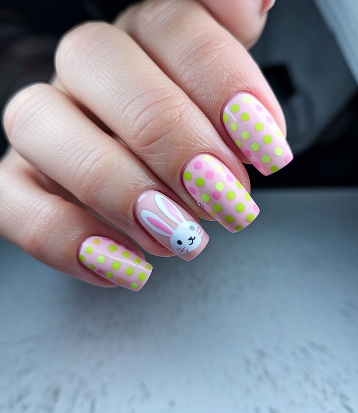 Square-shaped pink nails are topped with bright neon polka dots and a cute bunny accent nail. It’s cheerful and vibrant while still keeping a clean, glossy finish.