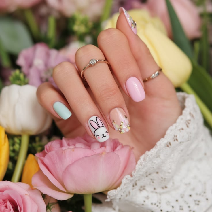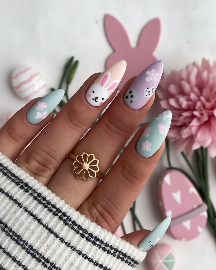 Matte pastel nails in mint, lilac, and blush showcase delicate florals and a charming bunny accent. The design feels soft, elegant, and beautifully spring-inspired.