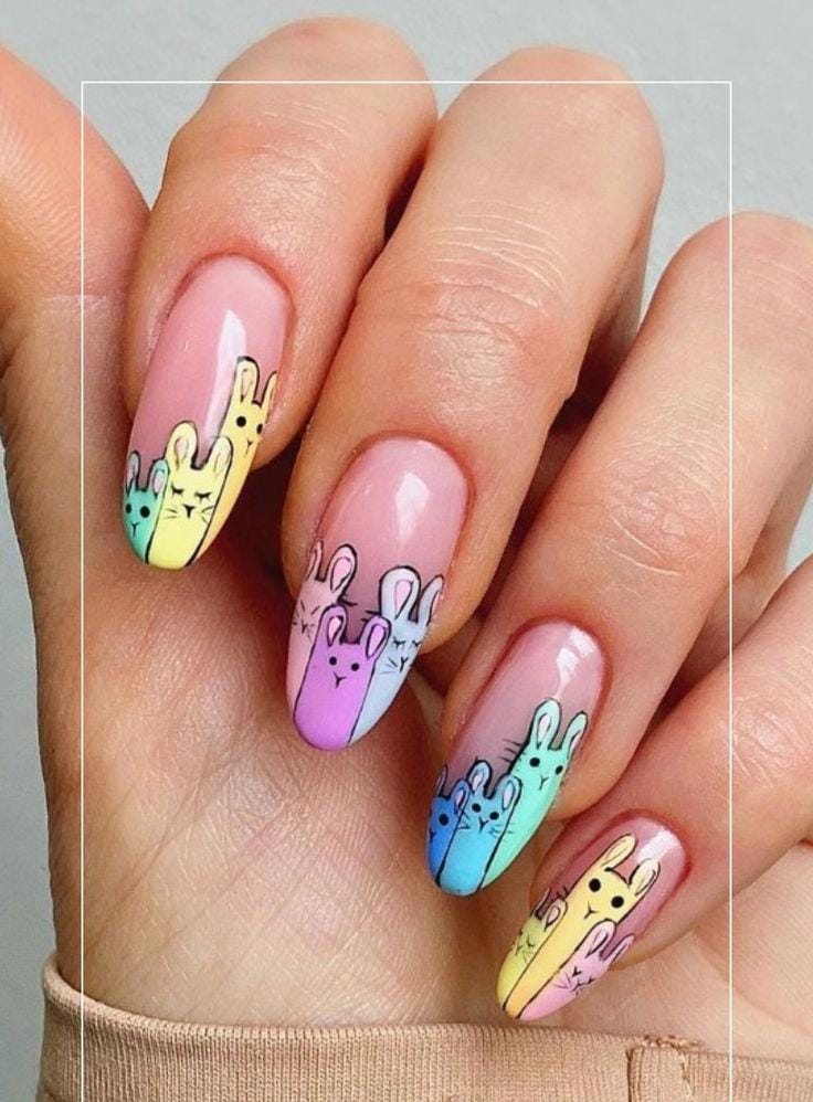 This design showcases soft pink nude nails decorated with colorful bunny faces in pastel shades. The smooth, glossy base keeps it classy while the cheerful bunny art adds a fun seasonal touch.