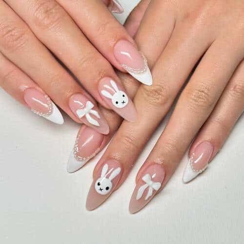 Sheer pink nails with crisp white French tips are elevated with delicate bunny and bow accents. The overall look is soft, feminine, and effortlessly classy for Easter celebrations.