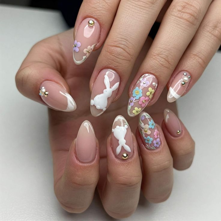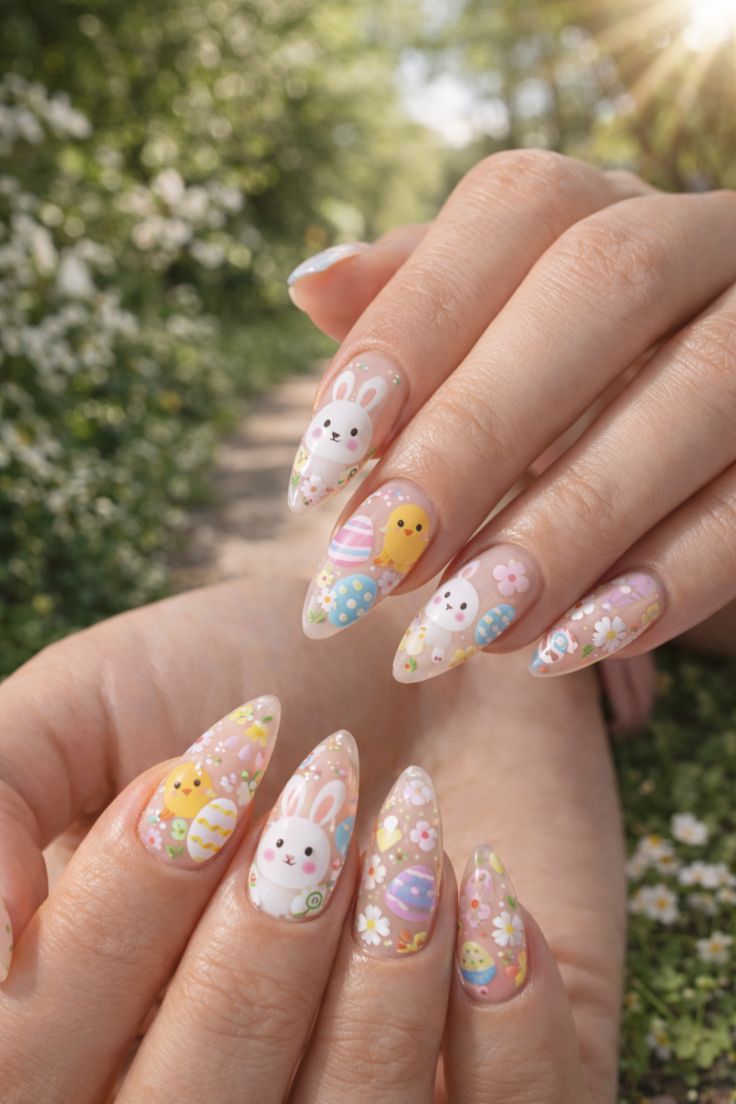 A sheer nude base is decorated with pastel bunnies, chicks, florals, and Easter eggs for a detailed yet airy look. The soft colors and almond shape create a dreamy, storybook spring aesthetic.