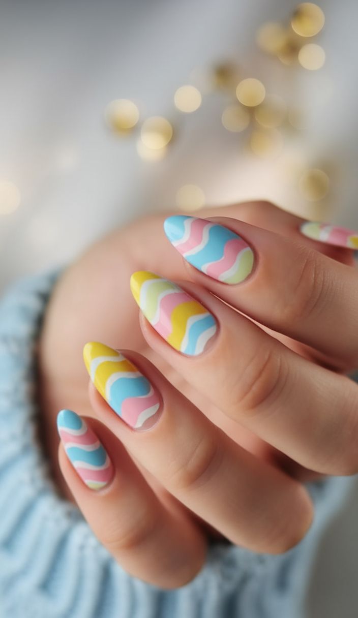 Wavy stripes in cheerful pastel tones like yellow, blue, and pink create a fun, retro-inspired design. The smooth almond shape balances the bold pattern with a clean, stylish finish.