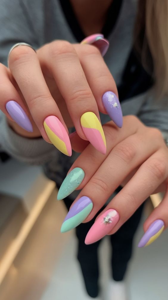 A mix of pastel colorblocking in pink, yellow, purple, and mint gives this set a fresh, modern feel. The long almond shape adds drama while keeping the look bright and festive.
