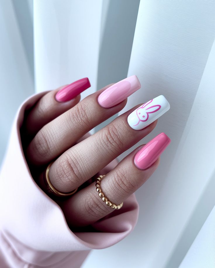 This design features a clean pink palette with a single white accent nail showcasing a simple bunny outline. The long, sleek shape and minimal art give it a modern and elegant Easter feel.