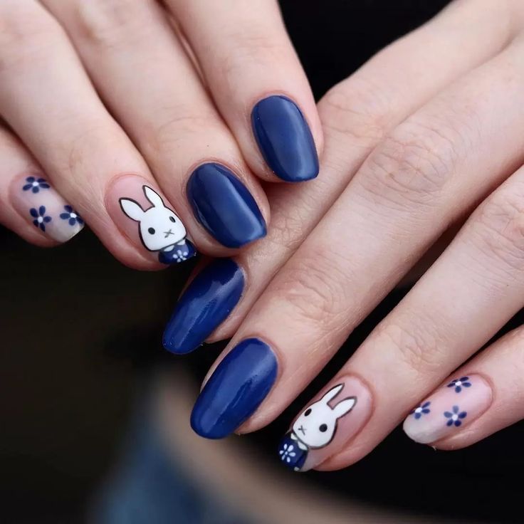 Deep navy nails are paired with simple bunny art and tiny floral details for a chic Easter twist. The glossy finish and minimal design make it feel classy with a subtle seasonal touch.