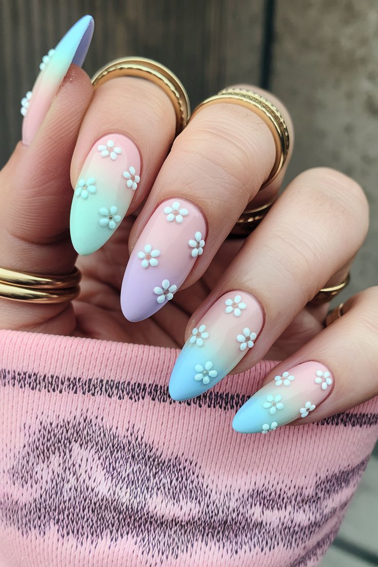 These almond-shaped nails feature a soft pastel ombré blend of pink, blue, and mint with delicate white daisy accents. The overall vibe is light, fresh, and perfectly spring-ready.