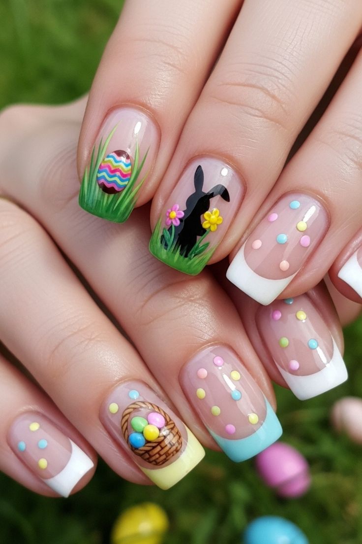 This design features soft nude nails with colorful French tips, playful polka dots, and adorable Easter accents like eggs, grass, and a bunny silhouette. The mix of pastel shades and delicate details gives it a cheerful yet polished spring vibe.