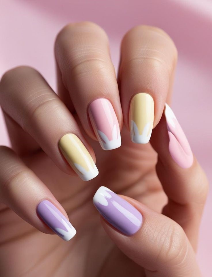 This design showcases muted pastel blocks with soft white bunny ear tips for a modern twist on a French manicure. The clean lines and gentle color palette keep it sophisticated and seasonal.