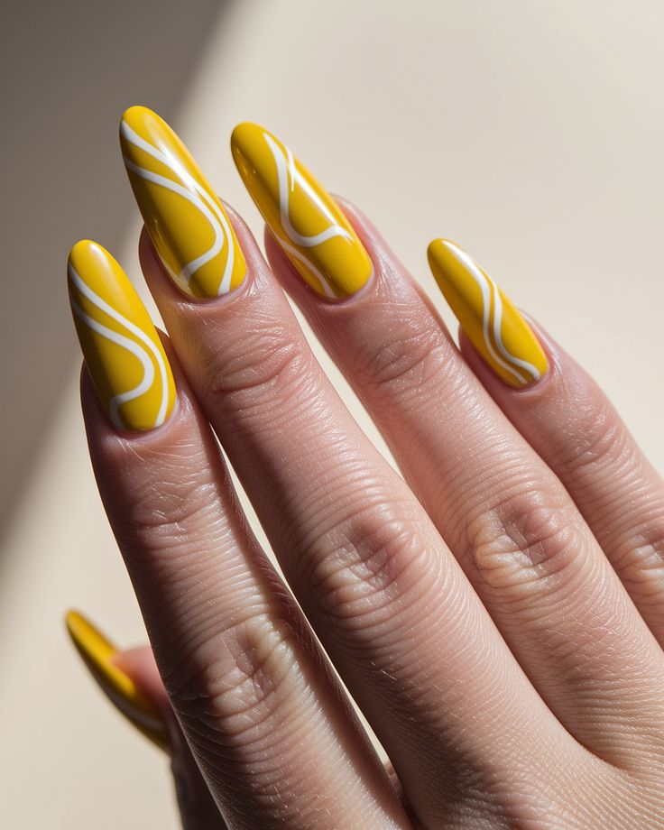 These long, almond-shaped nails feature a bold mustard yellow base with soft white swirl accents. The look feels modern and artsy while still keeping a classy, polished vibe.
