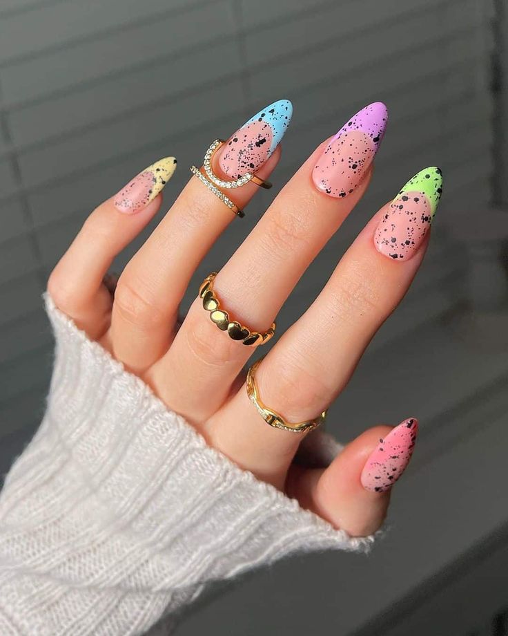 These almond nails showcase pastel French tips in different shades topped with subtle black speckles. The design feels trendy and festive, with a stylish nod to Easter egg patterns.