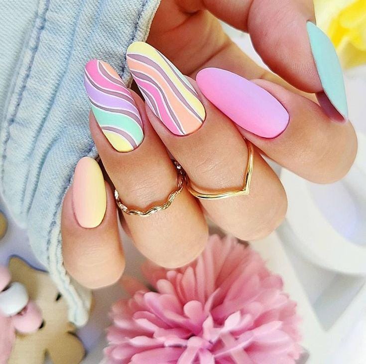 A blend of matte pastel shades and soft rainbow swirls creates a chic yet playful spring look. The design feels modern, smooth, and effortlessly stylish for Easter.