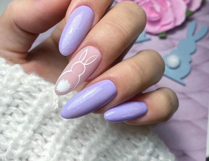 Soft lavender nails are paired with a subtle pink accent nail featuring a delicate bunny silhouette. The smooth, glossy finish and muted tones make this design refined, sweet, and perfectly seasonal.