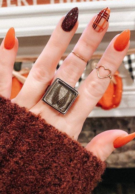 This design combines fiery orange nails, deep glittery burgundy, and chic plaid accents for a bold, cozy November vibe. A perfect mix of sophistication and fall warmth.