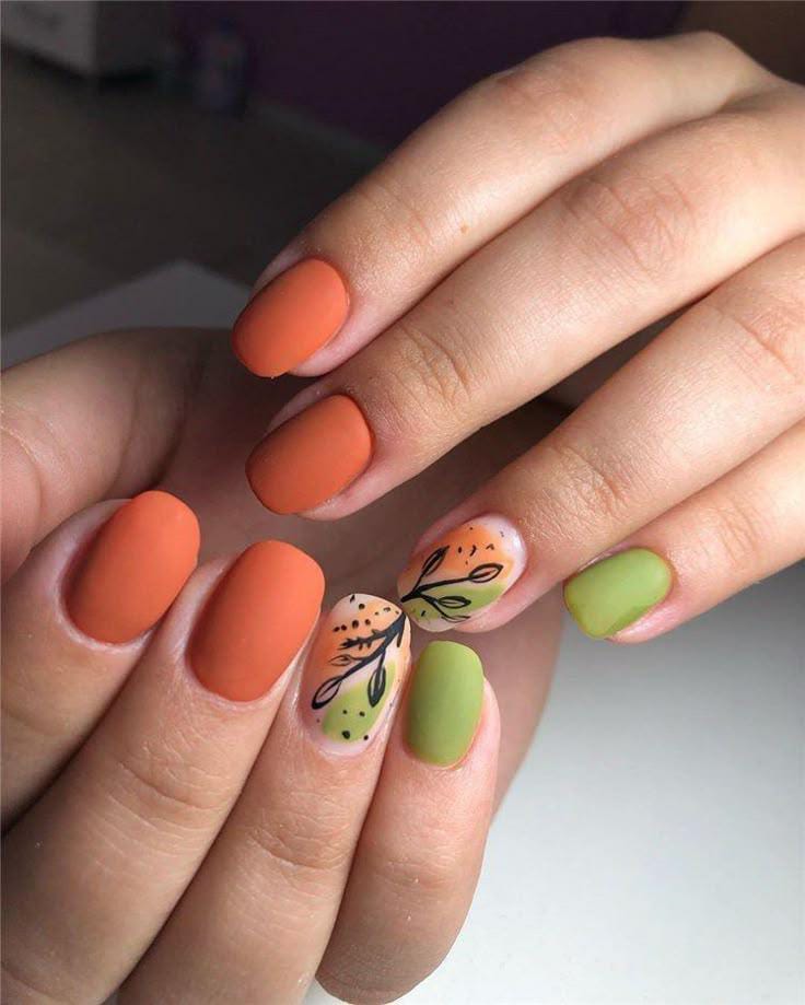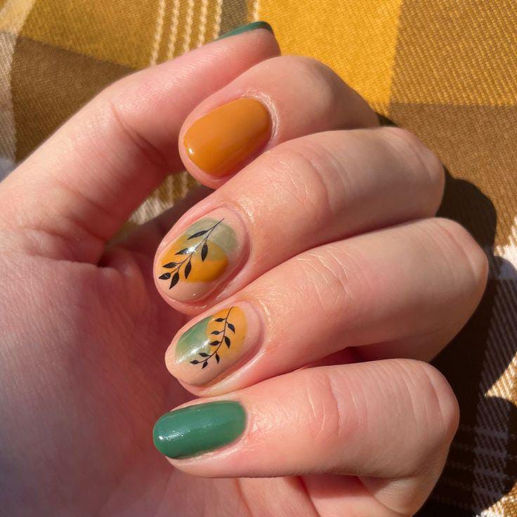 A matte mix of burnt orange and green nails with leafy accent art gives a bold yet earthy vibe, perfect for celebrating November’s harvest season.
