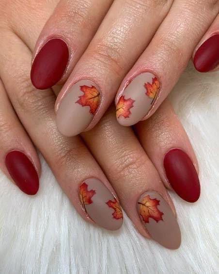 Muted beige nails paired with matte burgundy and delicate maple leaf art create a graceful, seasonal look. It’s subtle yet undeniably festive for November.