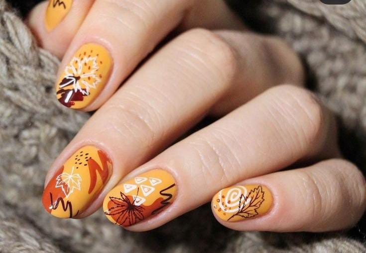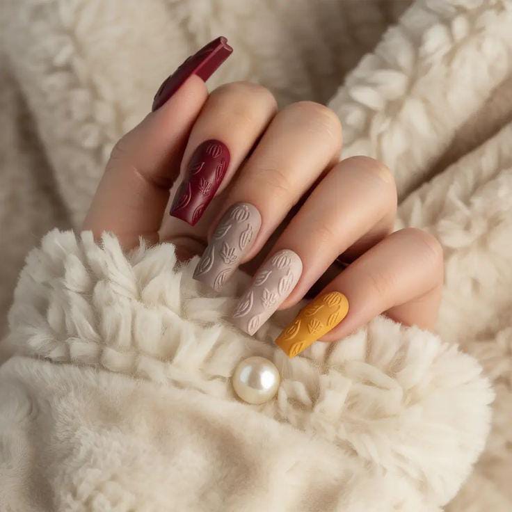 With a matte finish in deep burgundy, taupe, and mustard, these nails are styled with a knitted texture leaves effect that looks like a warm sweater. They radiate cozy November vibes.
