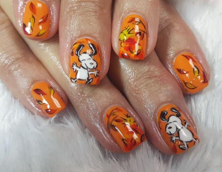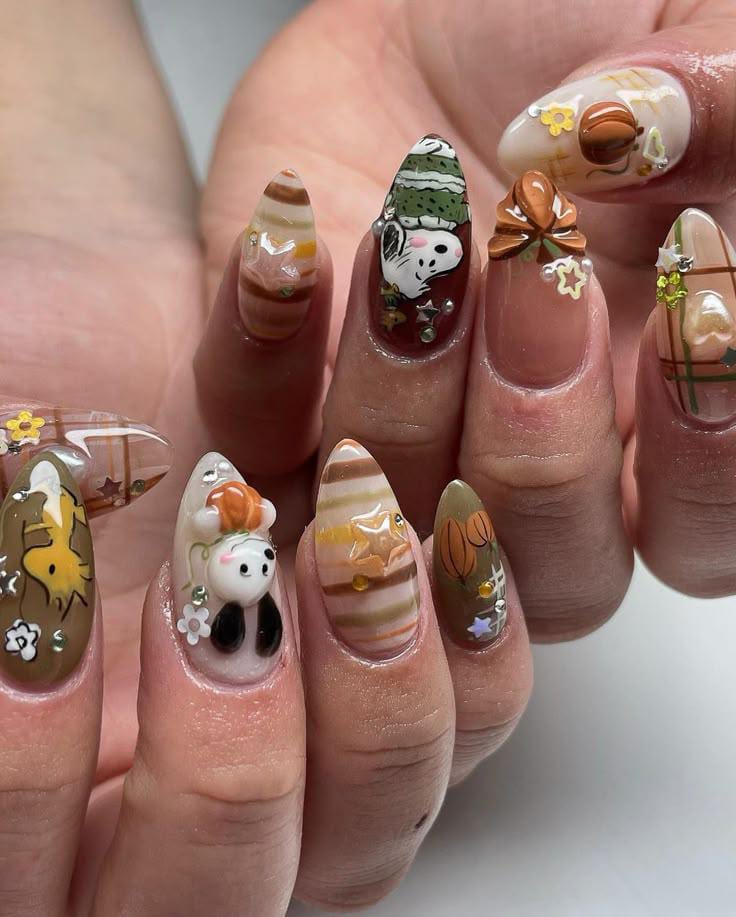 This orange-toned set with dancing Snoopy illustrations and falling leaves brings a cheerful, whimsical touch to fall nails. It’s festive, lighthearted, and full of personality.