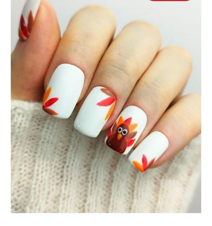 A playful and festive look with a white base, decorated with colorful turkey feathers and a cute turkey face, making it perfect for a Thanksgiving vibe.