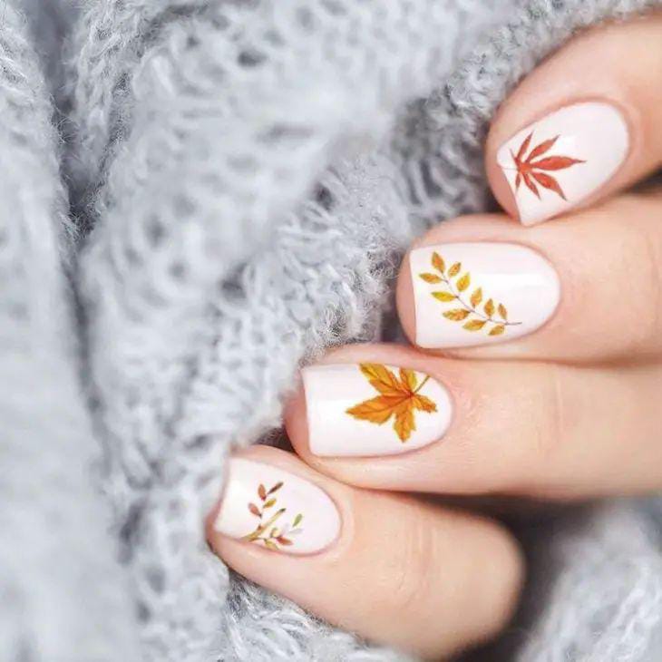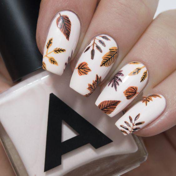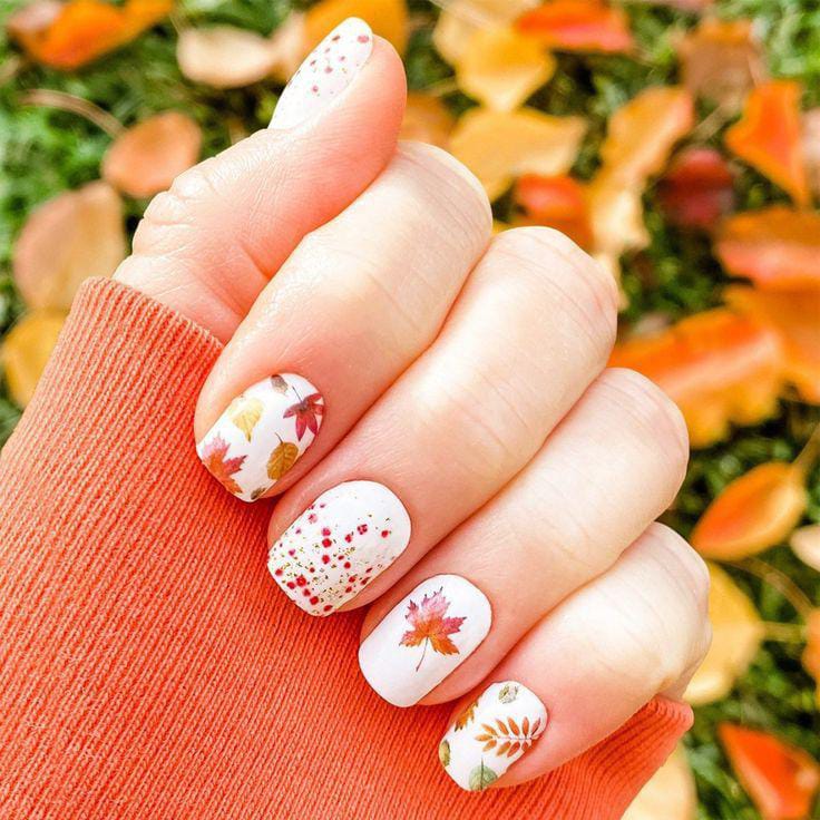Crisp white nails decorated with scattered orange and brown leaves offer a minimal yet classy fall aesthetic, ideal for a clean and modern November style.