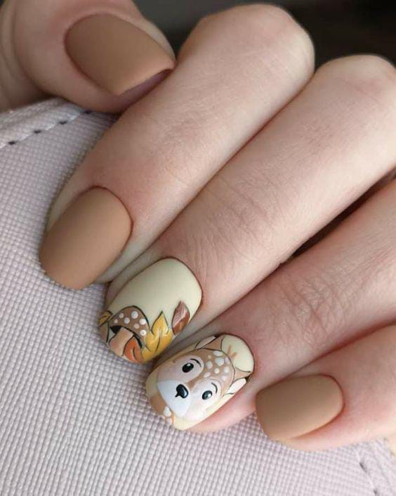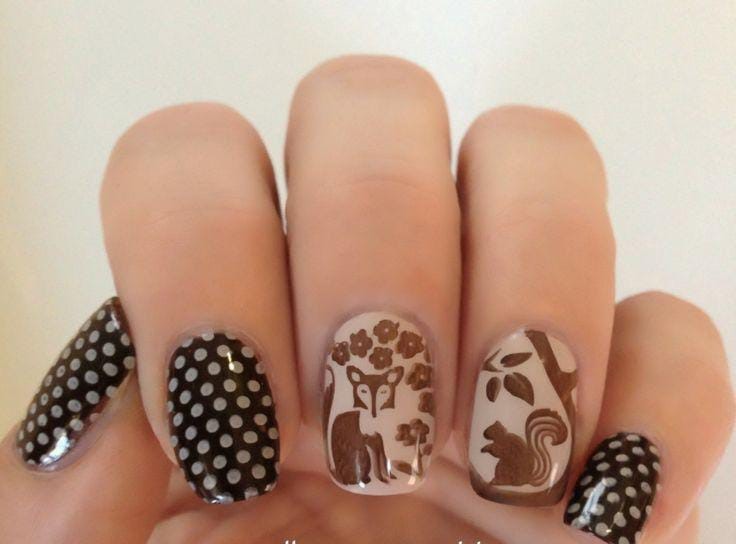 A cozy forest-inspired design featuring brown-toned woodland animals and floral patterns, paired with polka-dotted nails for a rustic charm.