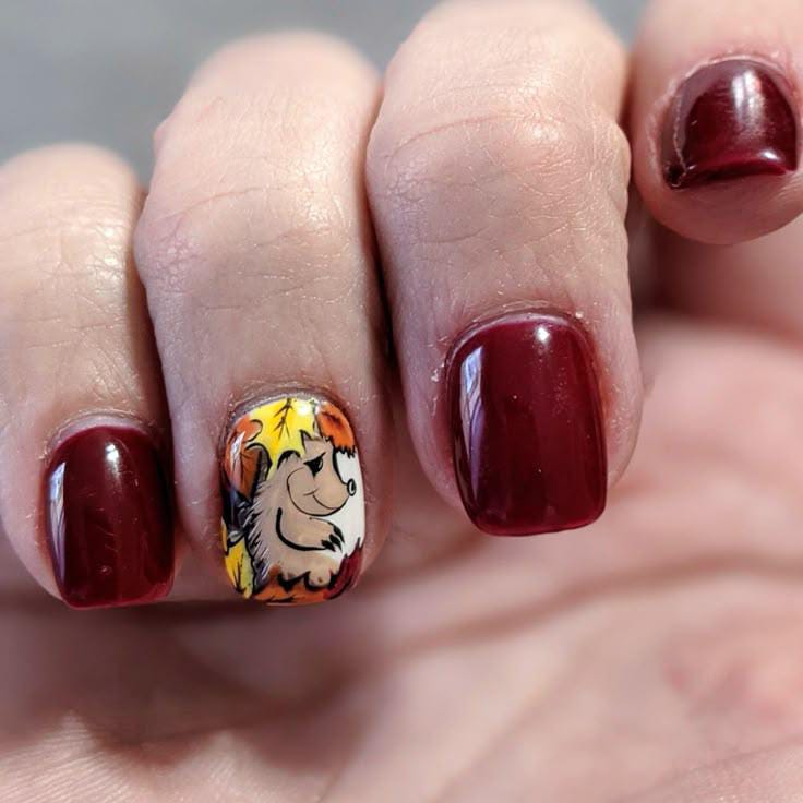 Deep maroon nails accented with a cheerful cartoon hedgehog surrounded by autumn leaves, blending fun and warmth for the season.