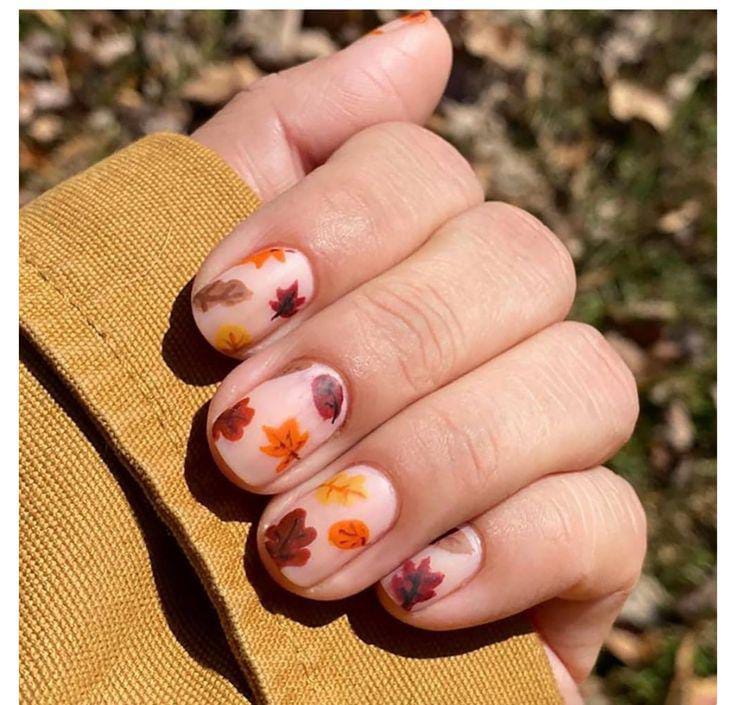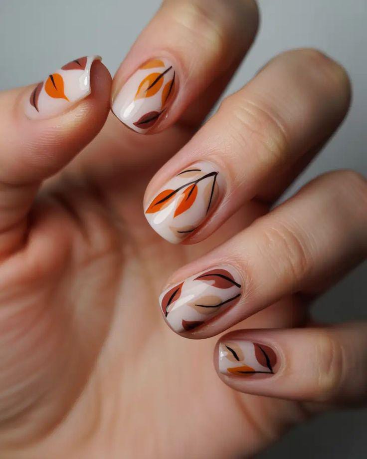 Soft nude nails accented with delicate leaf patterns in orange, brown, and mustard shades create a graceful fall-inspired look that feels both natural and elegant.