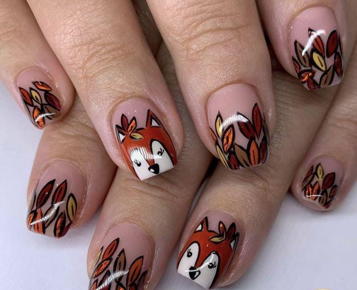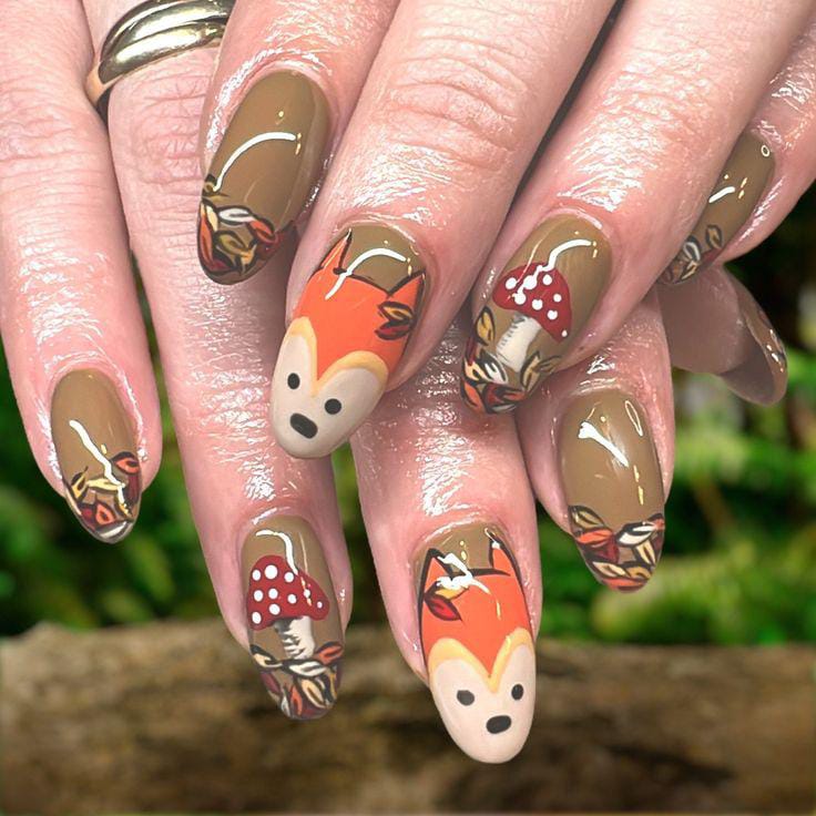 Earthy brown nails with whimsical fox and mushroom art, complemented by leafy accents, creating a magical woodland fairy-tale effect.