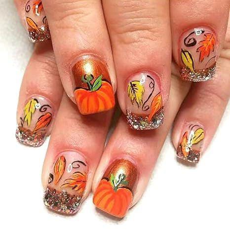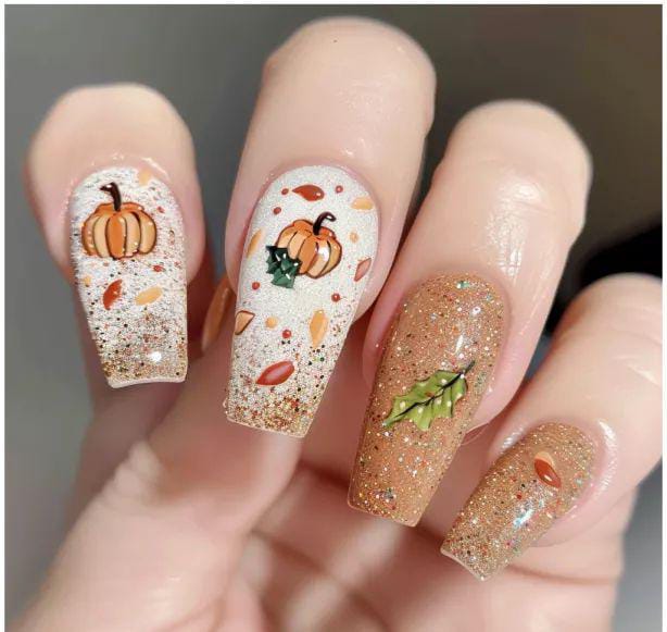 Rich bronze tones paired with hand-painted pumpkins and falling leaves give these nails a festive harvest look, accented with glitter tips for extra sparkle.