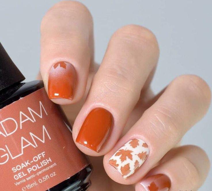 Burnt orange nails paired with a single accent of leaf prints on a cream base create a simple yet striking November look, perfect for autumn lovers.