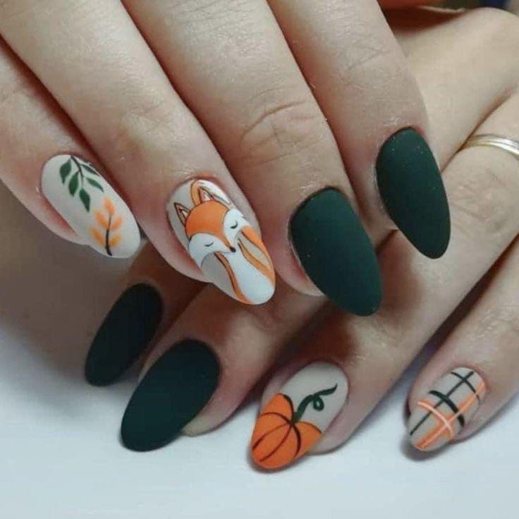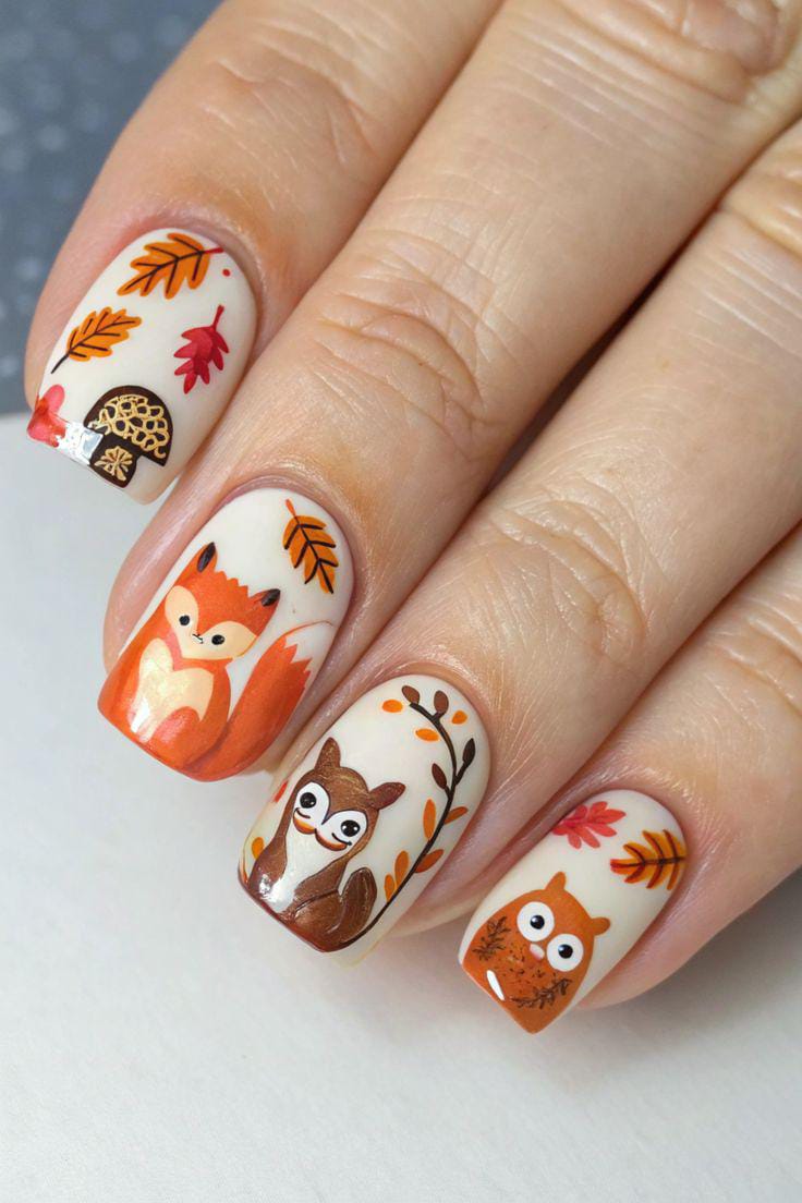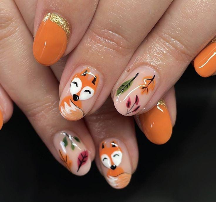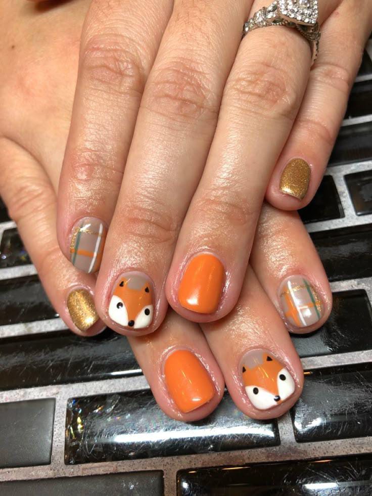Bright orange nails are mixed with adorable fox faces and plaid patterns accented in gold. The playful woodland theme meets sophisticated fall fashion, making it a fun yet classy November look.