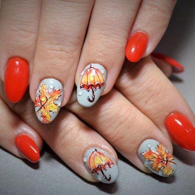 Bold orange nails paired with hand-painted umbrellas and maple leaves on soft gray, giving a warm yet rainy-day November look.